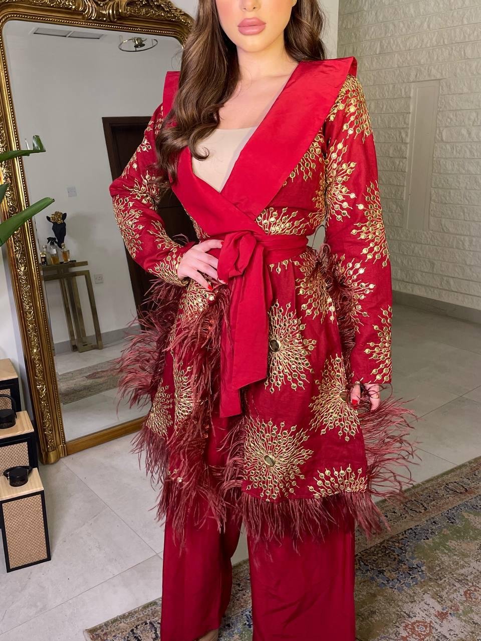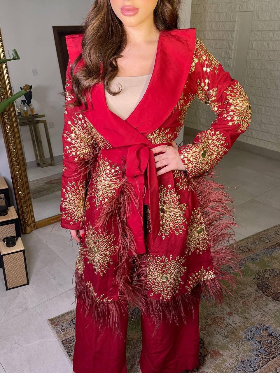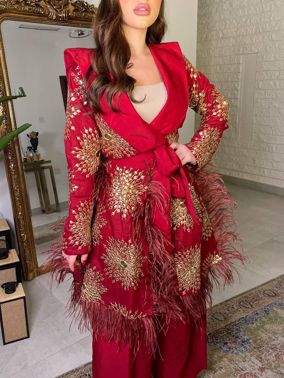 Embrace elegance in our red suit with nylon pyjama. Featuring exquisite feather details and designer work, this ensemble captures a unique blend of style and sophistication.