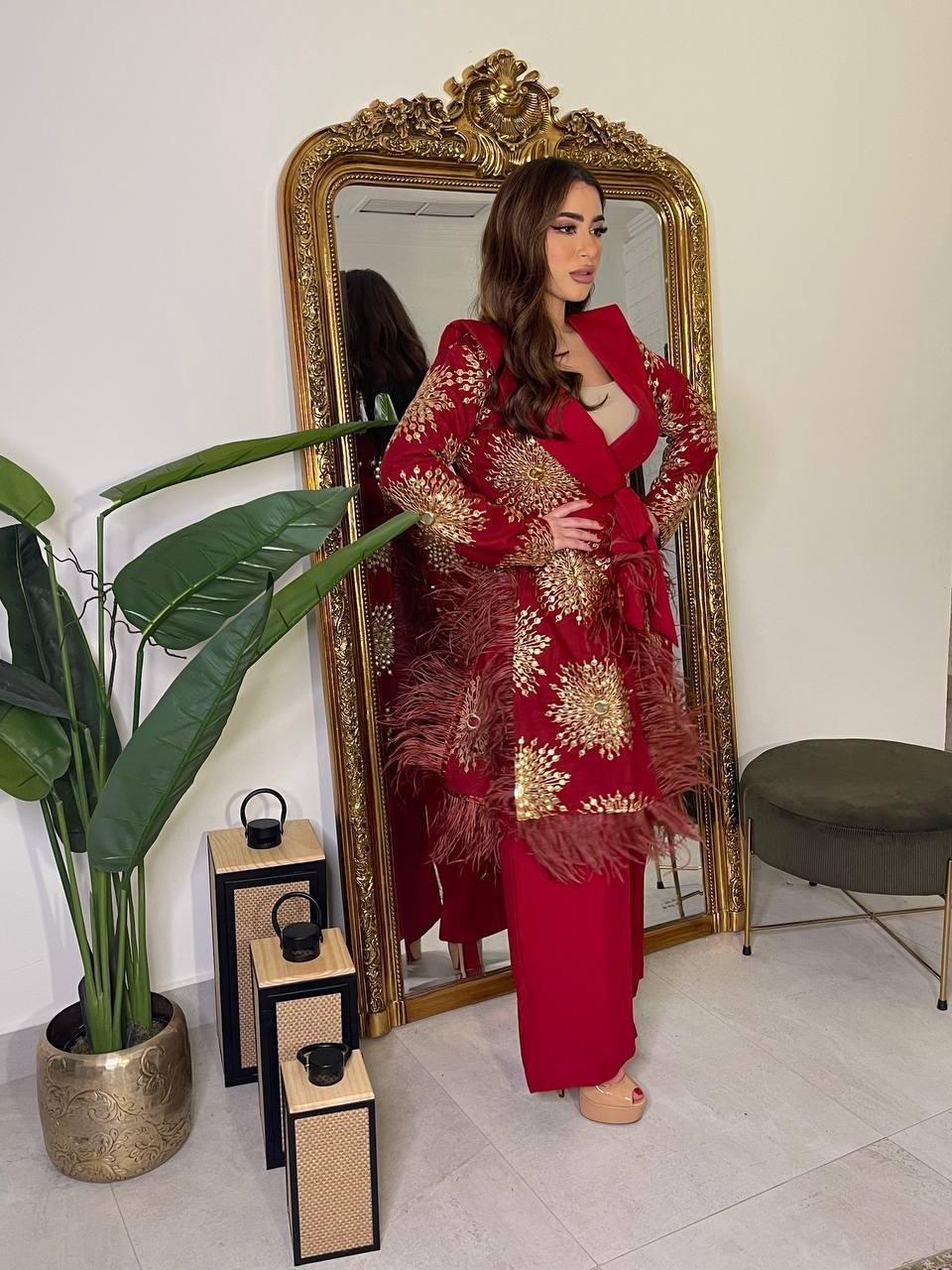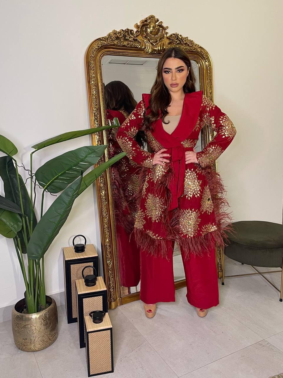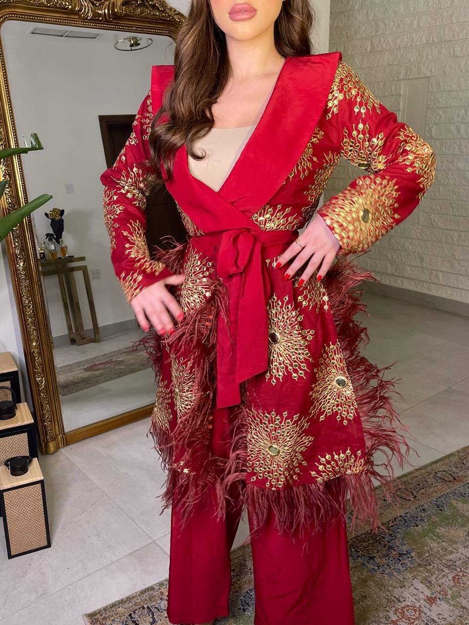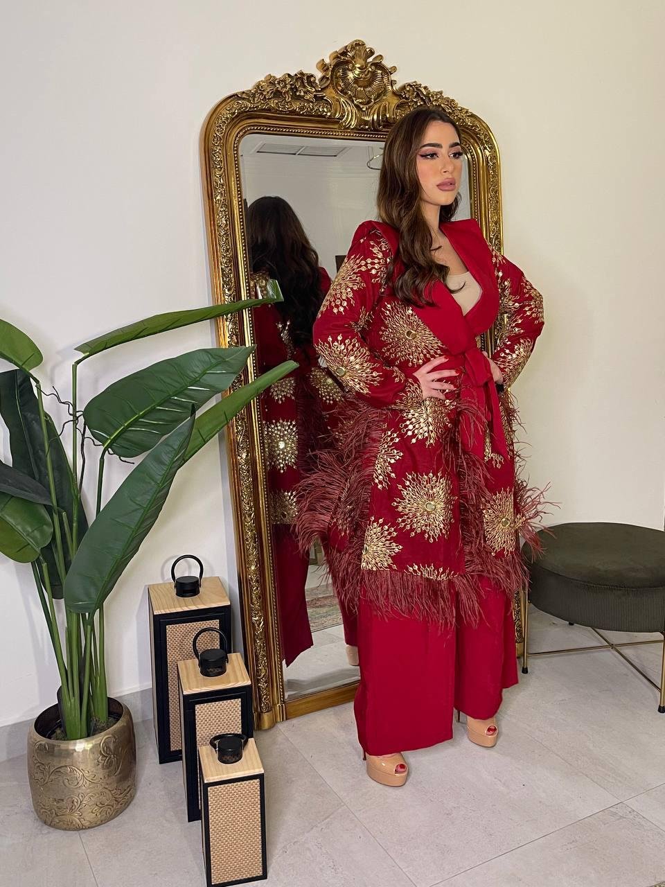 Embrace elegance in our red suit with nylon pyjama. Featuring exquisite feather details and designer work, this ensemble captures a unique blend of style and sophistication.
