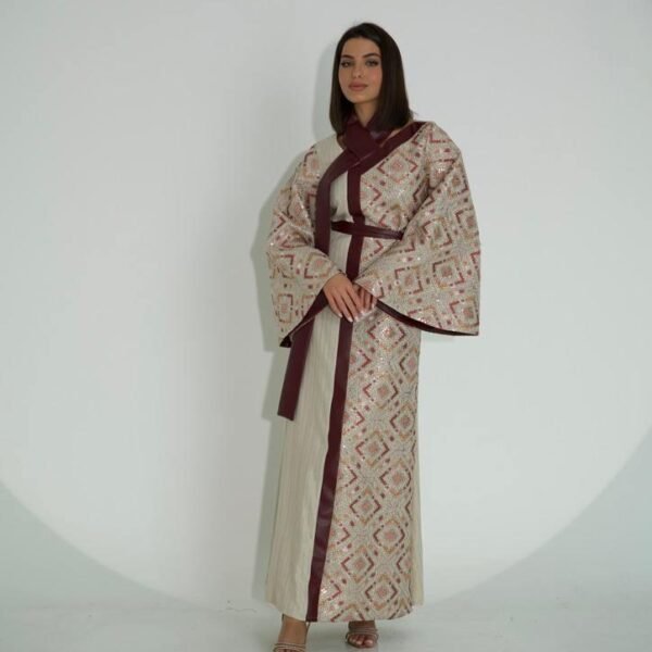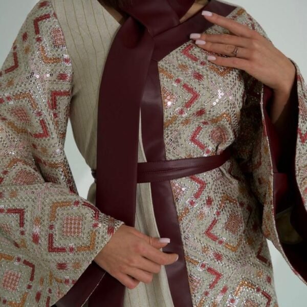 Embroidered Kaftan with Linen Stripes and Leather Touch Design