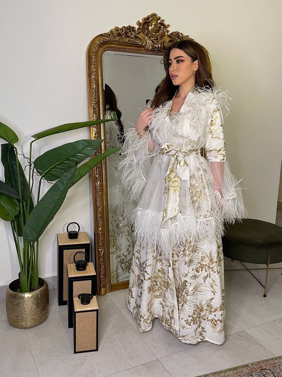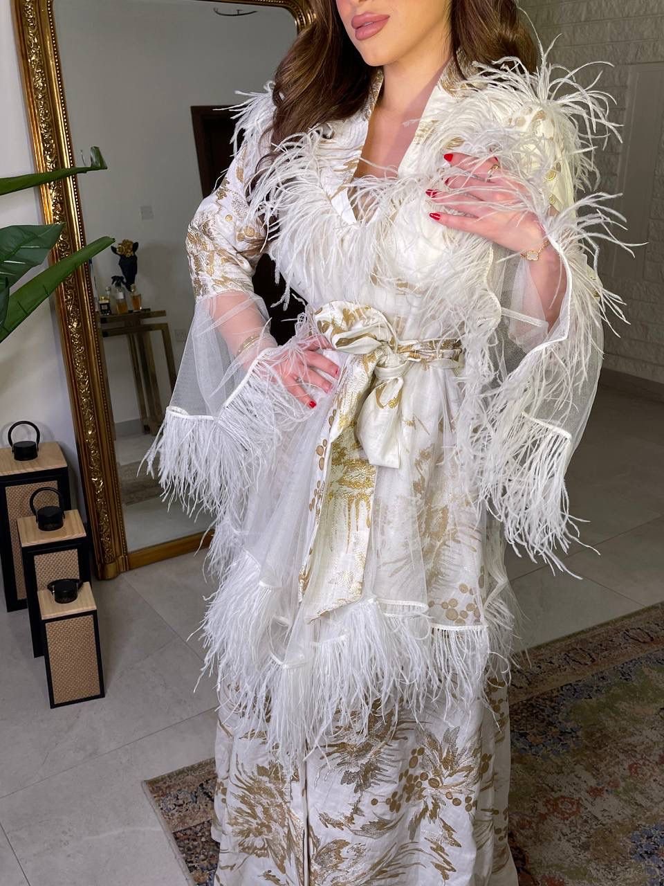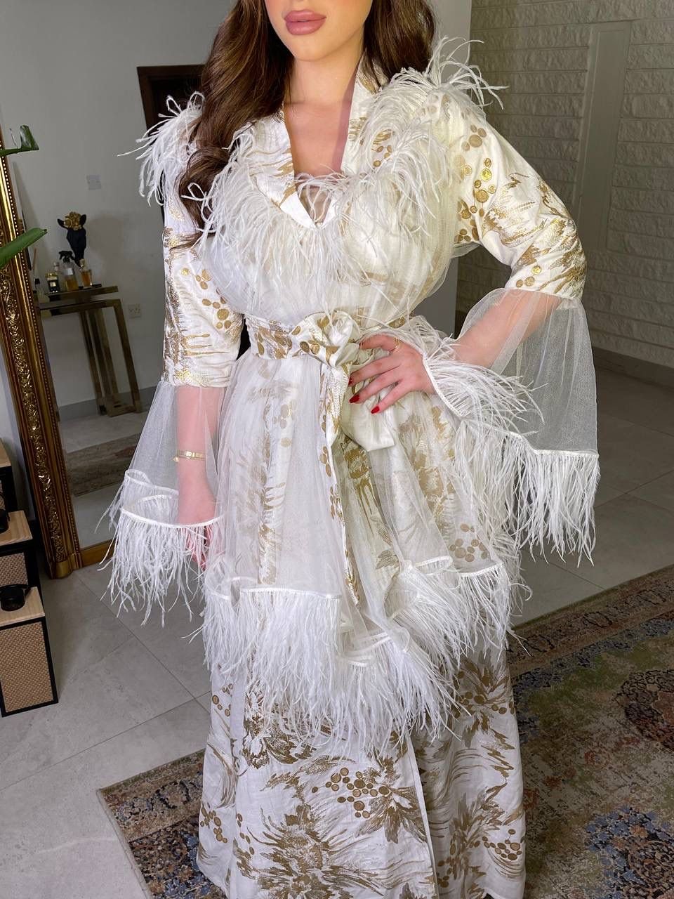 Elevate your style with our ankle-length white cotton jeans coat. Adorned with floral work and accented by red piping from collar to bottom and on pocket edges, the addition of a waist belt completes this chic ensemble.