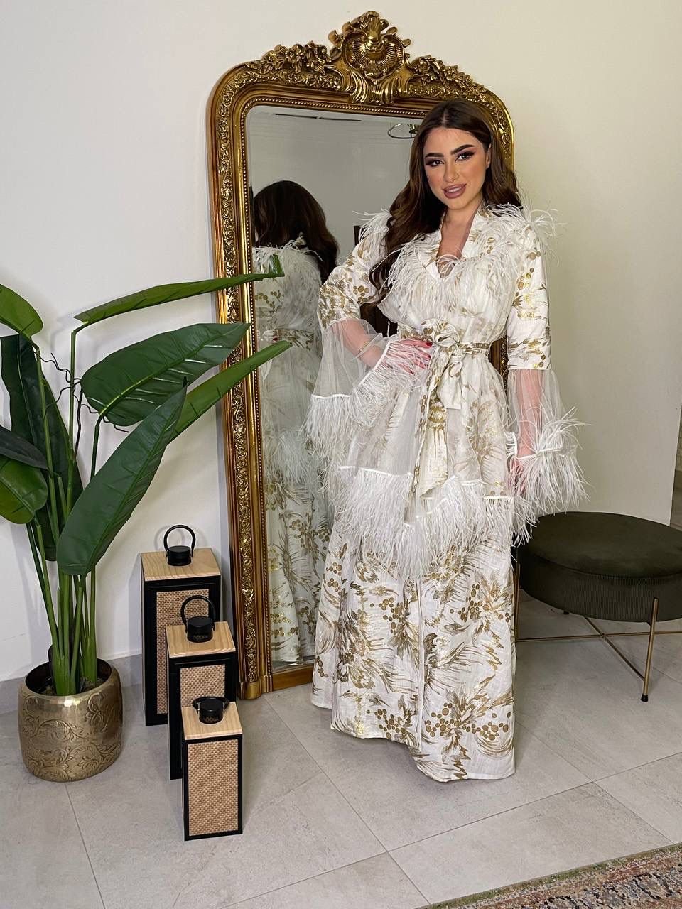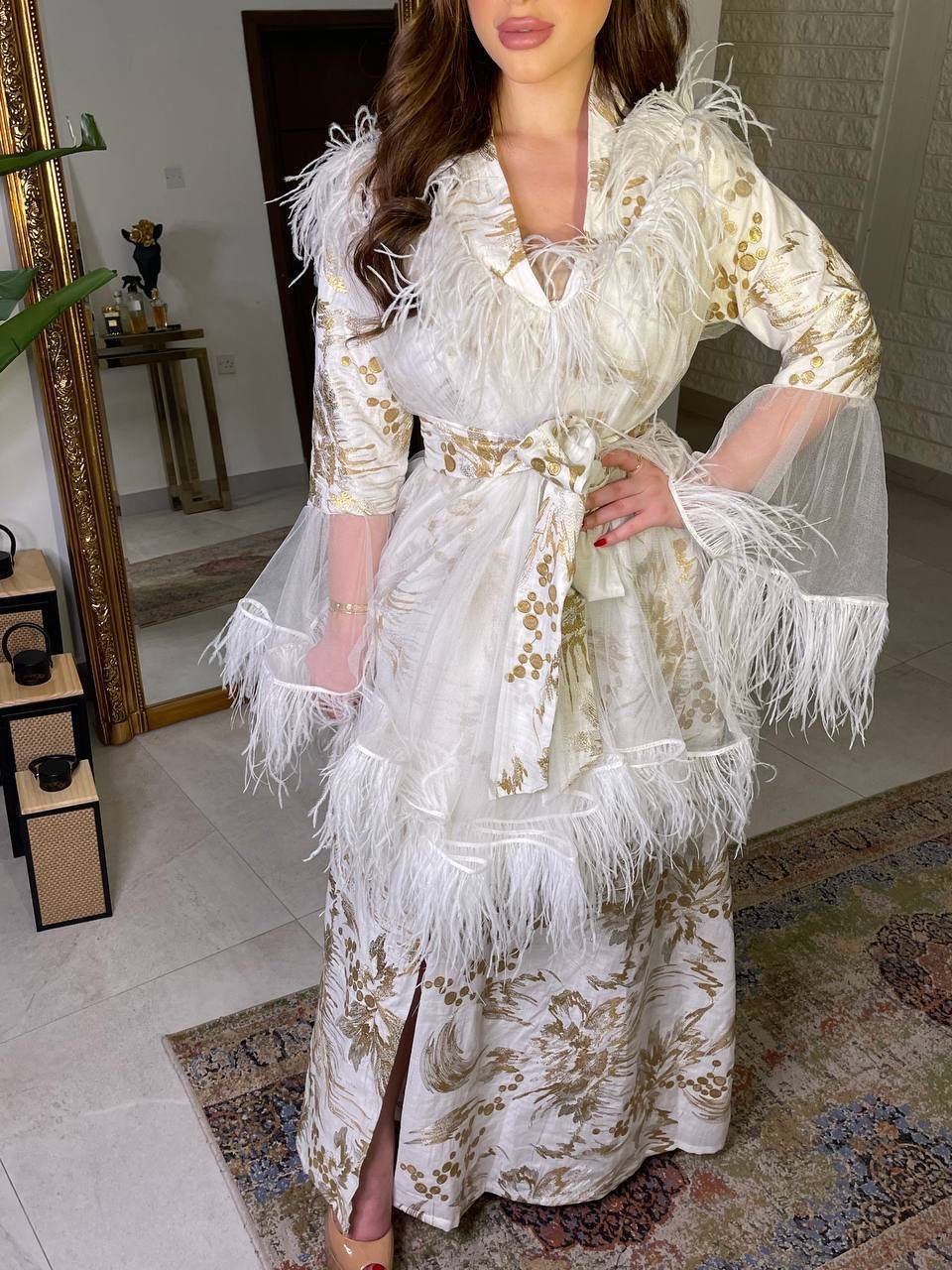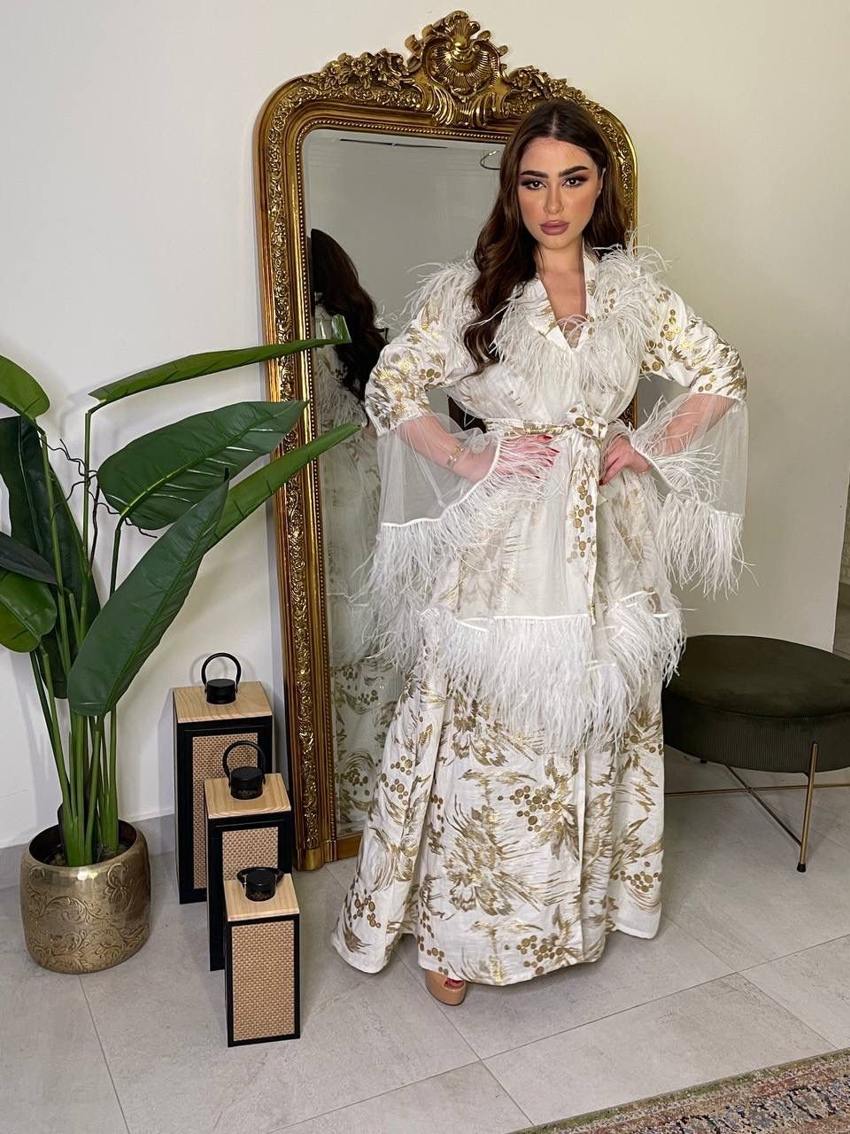 Elevate your style with our ankle-length white cotton jeans coat. Adorned with floral work and accented by red piping from collar to bottom and on pocket edges, the addition of a waist belt completes this chic ensemble.