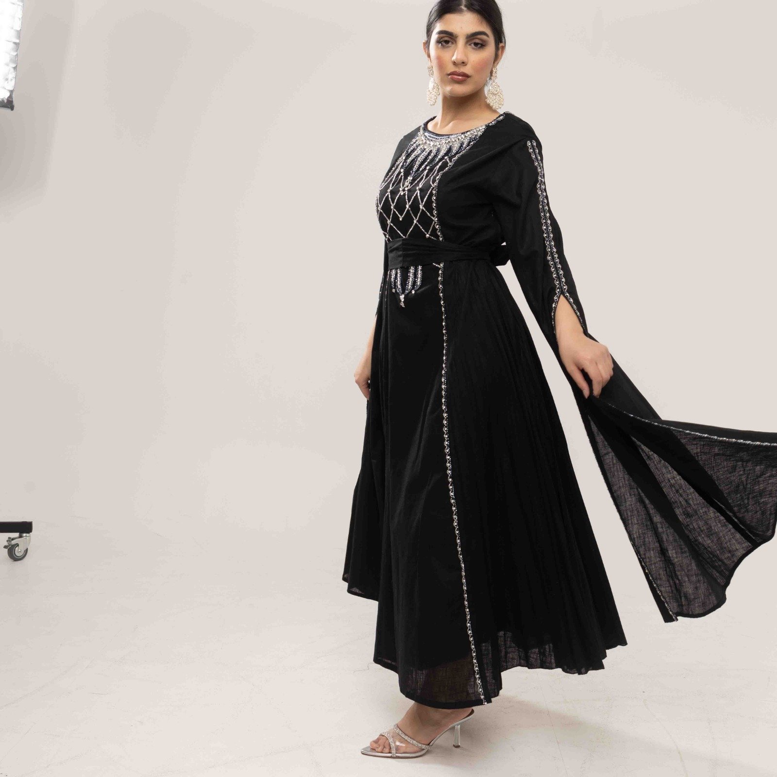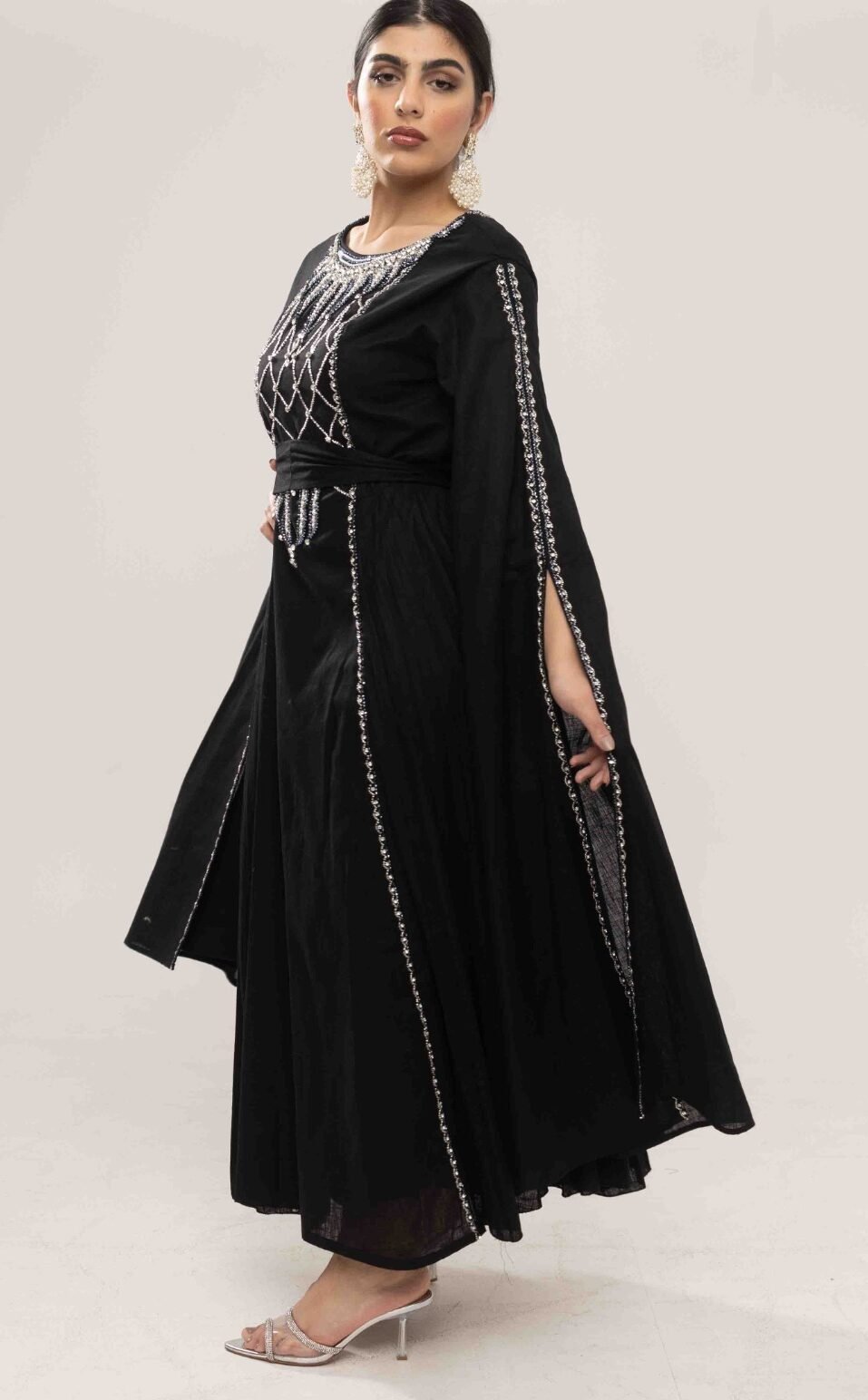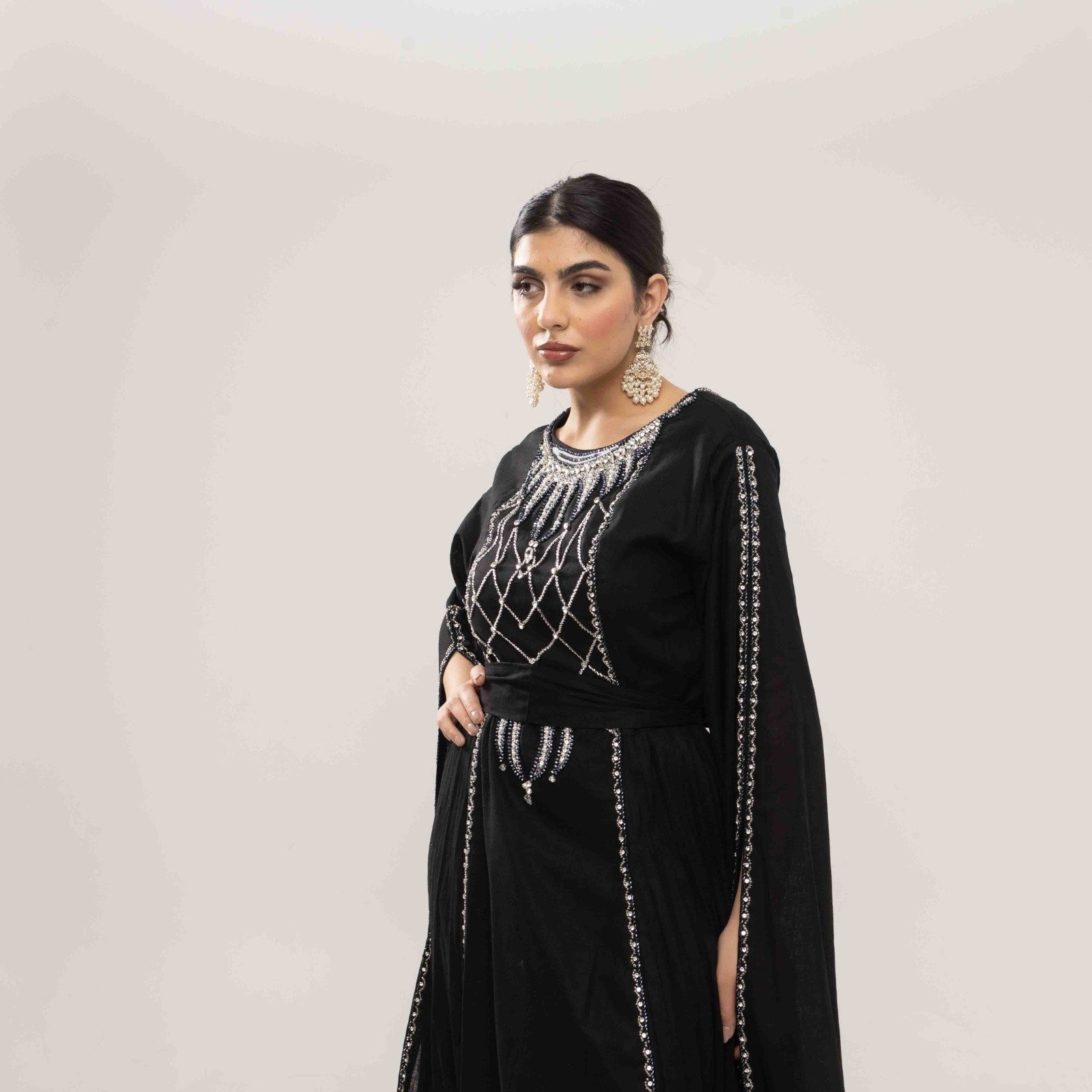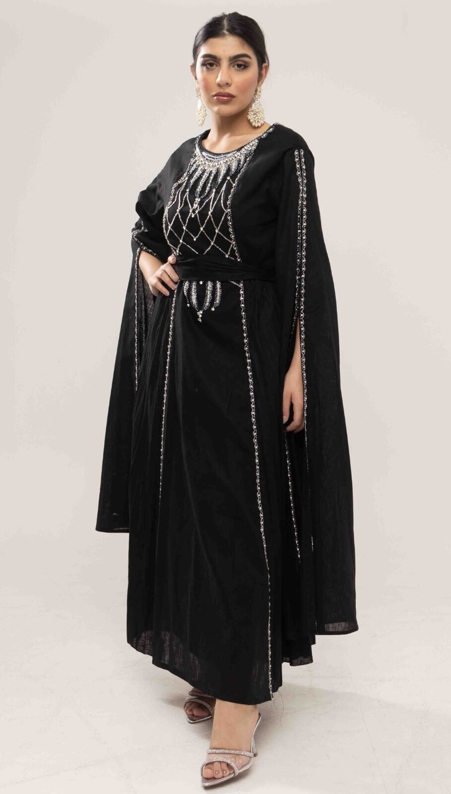 Elevate your style with our hand-embroidered Black Kaftan, crafted from luxurious Lennon Cloth. Perfect for adding a touch of elegance to any occasion.