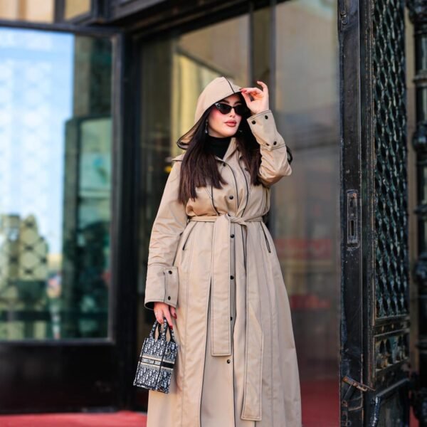 The model is 5’7″ and she is wearing size M.